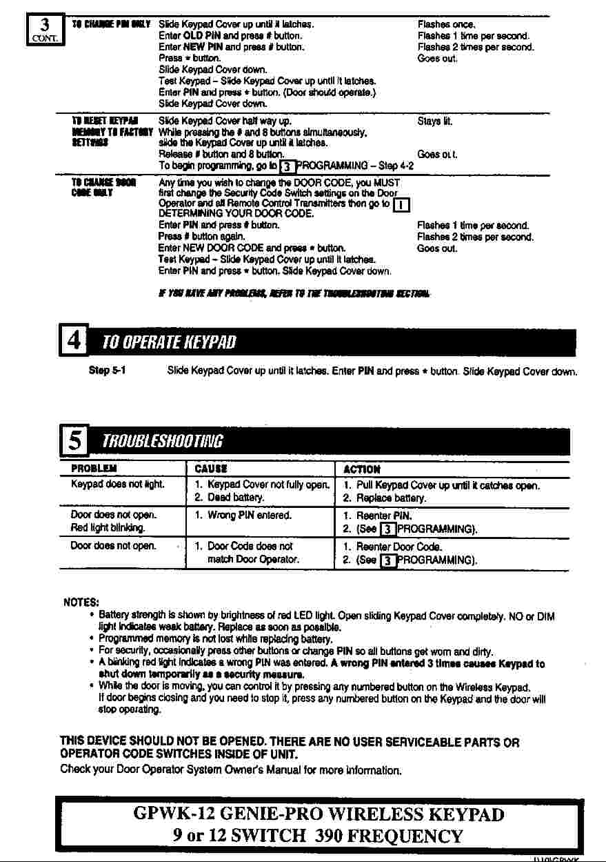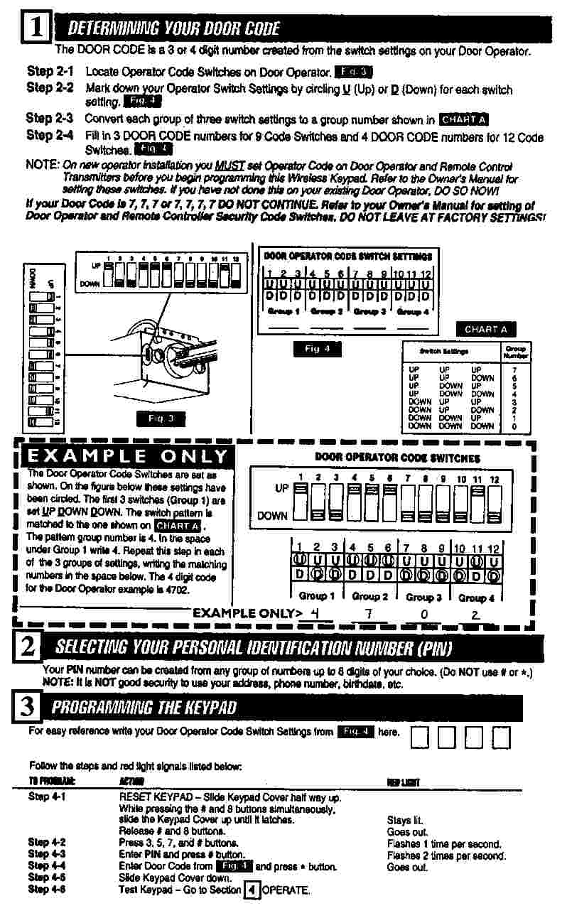 A Moving Door can cause serious injury or death. 1 Keep people clear of opening while Door is moving. 2 Do Not allow children to play with Wireless Keypad. 3 During programming, the Door Opener could begin to run, so stay away from the moving Door and its parts. To keep the Door from moving, close the Door and disconnect it from the Opener by pulling the Emergency Release Cord.